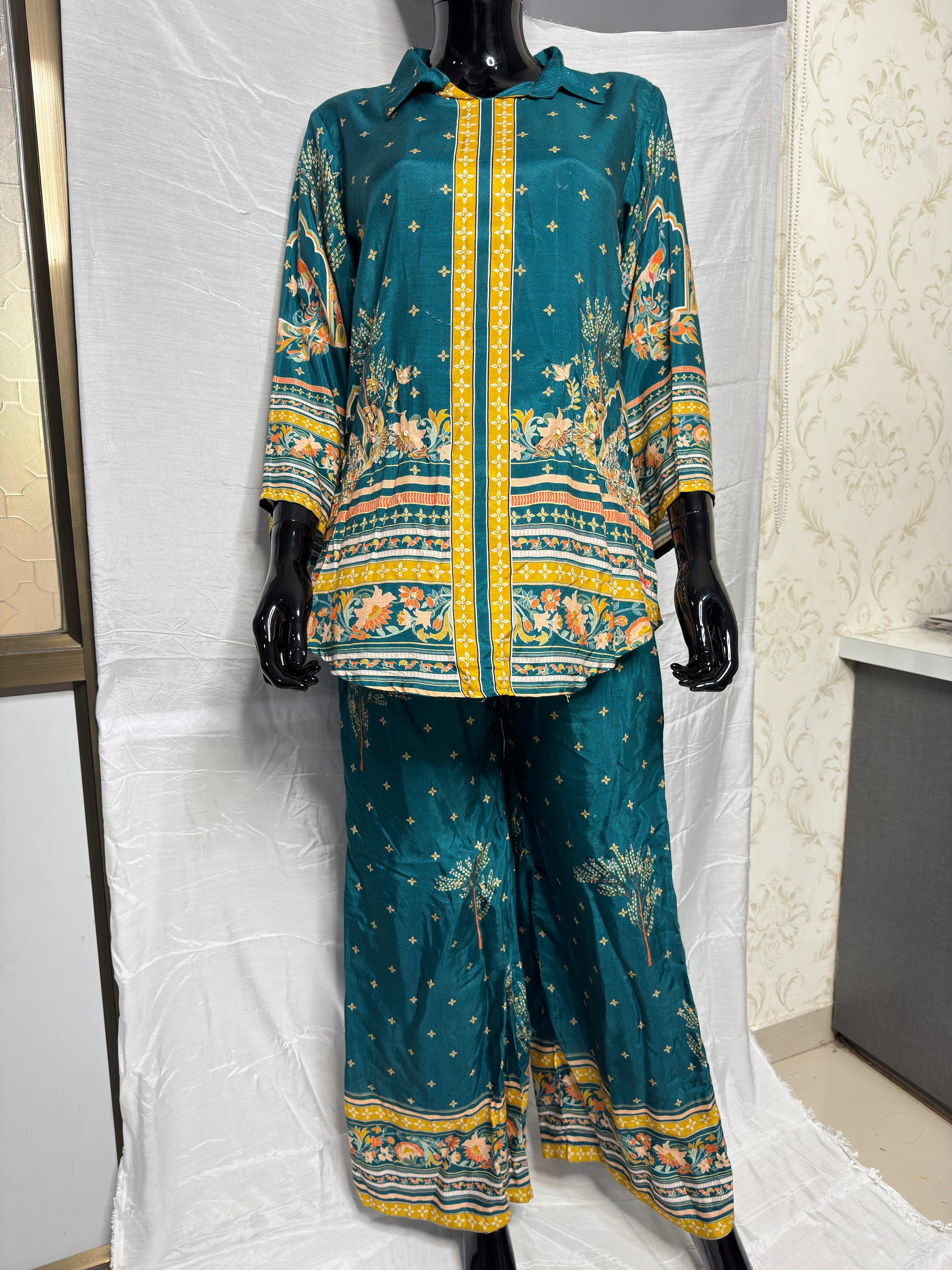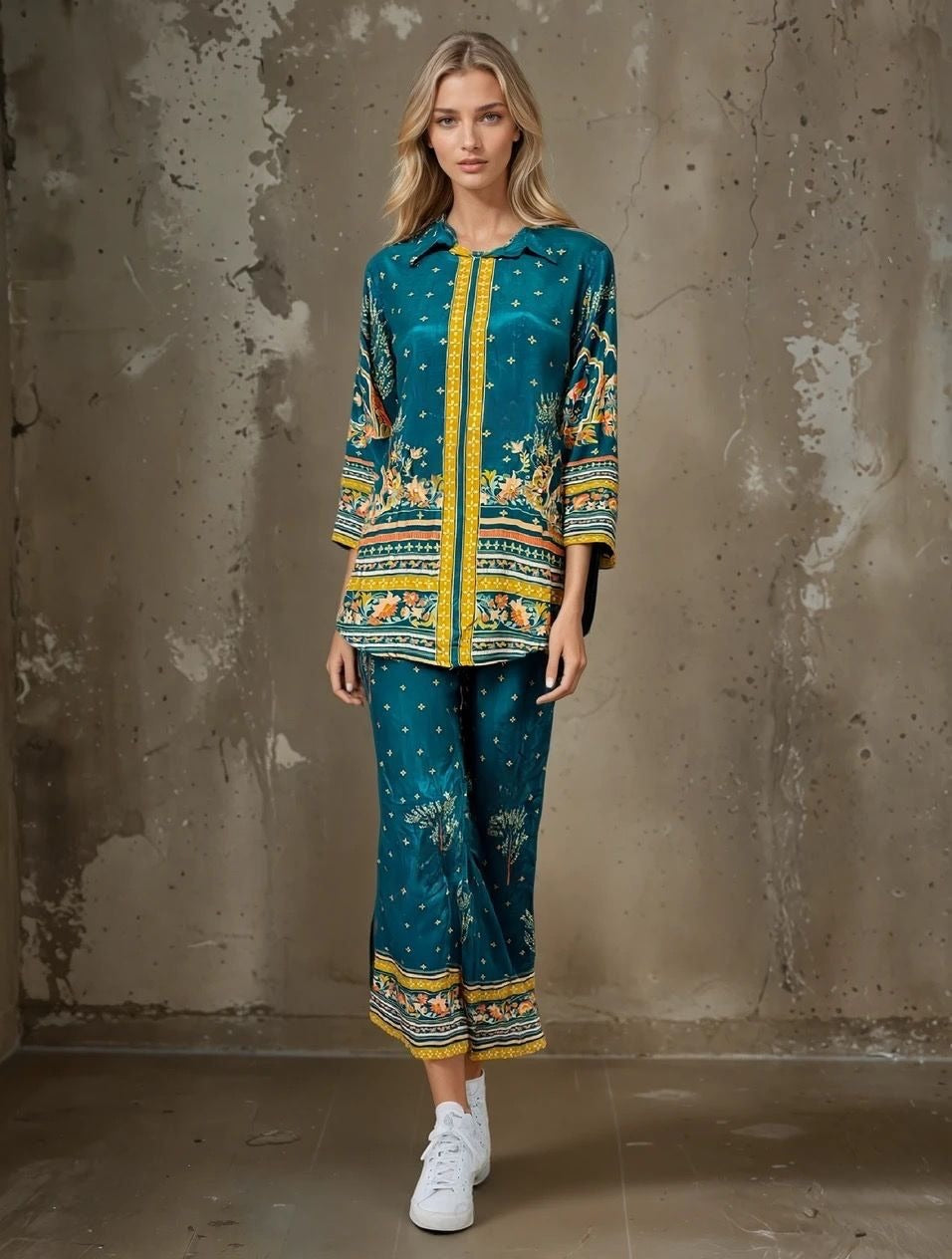 Step into elegance with this pure muslin printed co-ord set. Designed in a vibrant teal base with yellow floral and ethnic motifs, it combines traditional charm with modern comfort. Lightweight and flowy, it's ideal for festive or casual occasions.