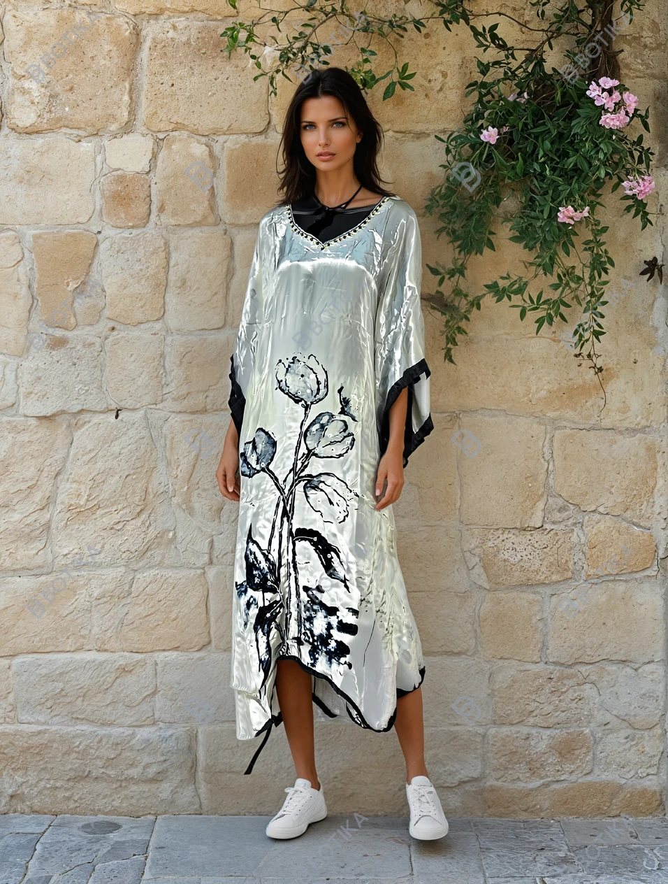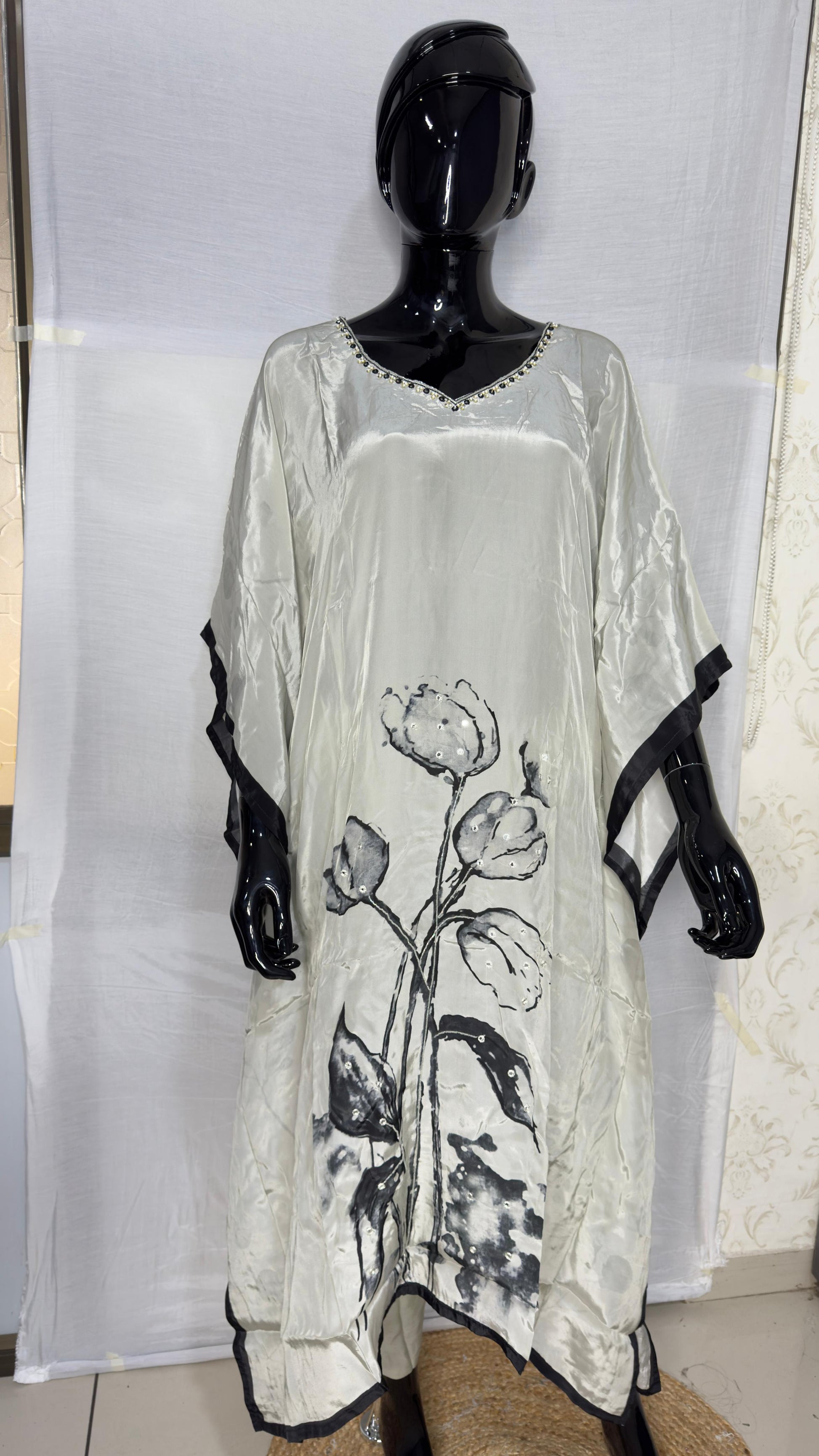 Channel breezy elegance with this luxurious floral print kaftan crafted from high-quality natural crepe fabric. The smooth drape, subtle sheen, and fluid silhouette make this dress a stunning choice for resort wear, casual chic, or summer evenings. The hand-painted effect floral motif adds an artistic touch, while the relaxed cut ensures comfort without compromising on style.